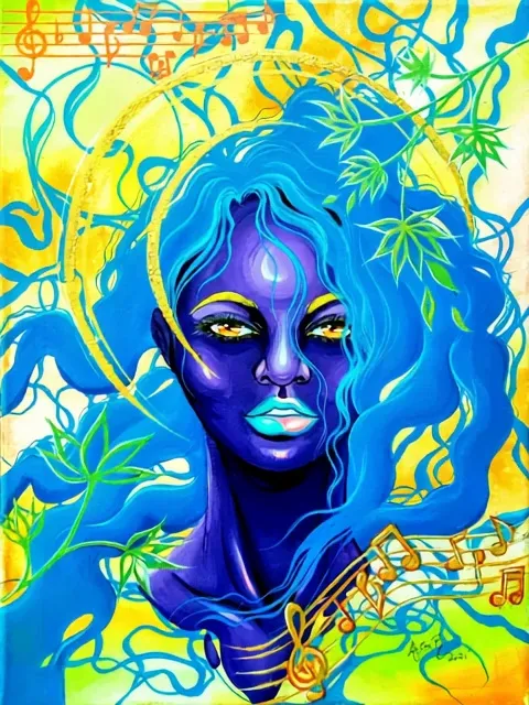 The beautiful woman with purple skin, yellow orange colored eyes turquoise lips and long blue hair. The woman's hair is blowing in one side direction while the abstract blue lines swirling