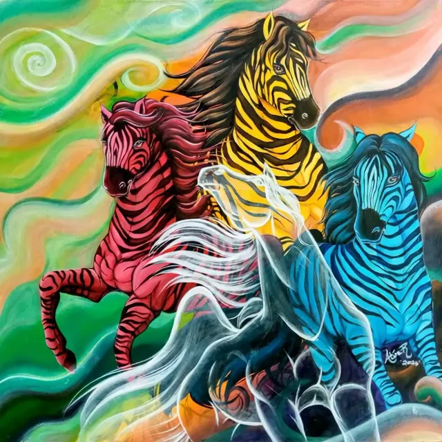 Create a surreal, high-energy animation featuring a herd of vividly colored zebras galloping through a dreamlike, swirling landscape. Each zebra has a unique color pattern: one red with black stripes, one yellow with black stripes, one blue with black stripes, and one ethereal white, almost transparent, glowing with soft light. Their manes flow wildly as they run in unison, surrounded by colorful, flowing winds in shades of green, orange, and teal. The background should pulse with swirling energy and abstract waves, creating a sense of motion and freedom. Use a fantasy art style, fluid transitions, and emphasize the feeling of wild spirit and unity.