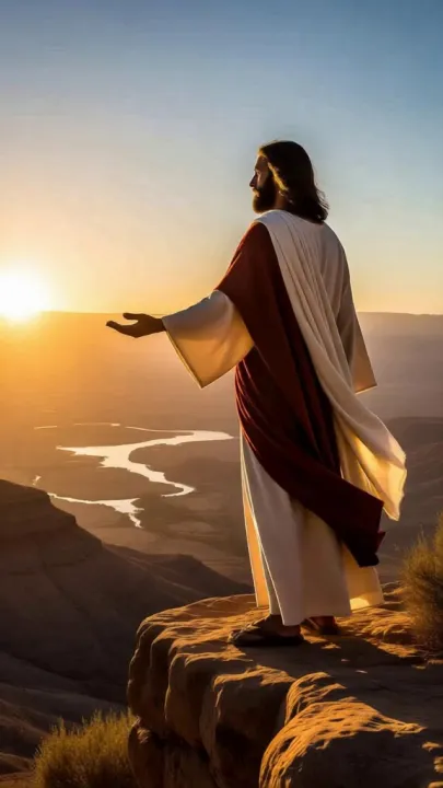 A poignant and reflective biblical scene on Mount Nebo: Moses stands on a high, rocky cliff overlooking the vast, sunlit promised land below. His face is marked with both sorrow and acceptance, knowing he cannot enter the land he led his people toward. The gentle wind blows his robes as he gazes thoughtfully at the distant landscape bathed in golden light. The atmosphere is quiet and contemplative, filled with a sense of farewell and divine will. Moses’s figure is silhouetted against a peaceful sky as the sun sets, symbolizing the end of his journey.
