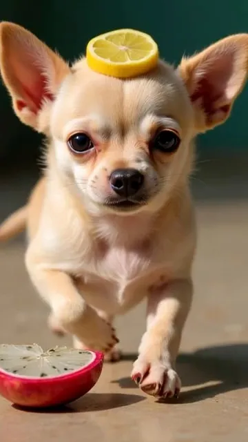 Chihuahua puppy sneezes lemon off head, chases dragon fruit collar.