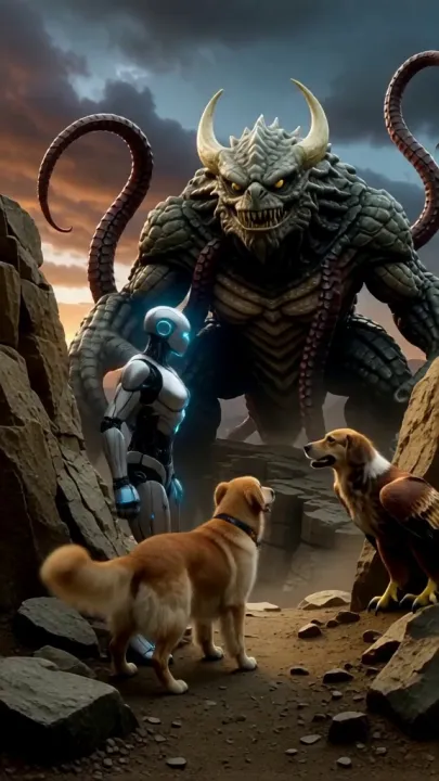 android, dog, and hawk escaping from the large 7-headed one-eyed monster with tentacles