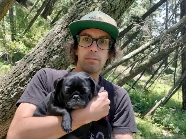 robopingA man holding a small black pug in a glowing forest. The pug’s eyes open with a soft golden light, it licks his face, then looks forward with tongue out smiling. Gentle sparkles drift in the air, warm magical glow, peaceful and heartwarming, 5-second HD animation with smooth motion and soft light effects.