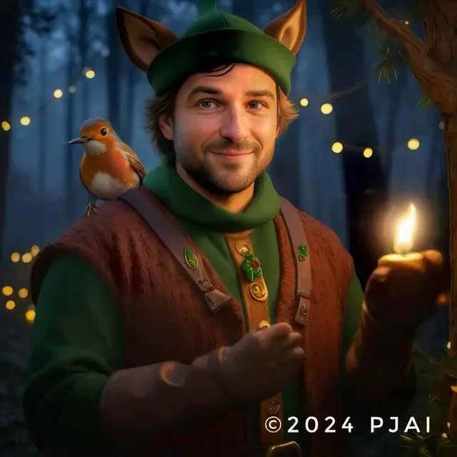 A person clad in a vibrant green costume with pointed elf ears gently holds a glowing candle, illuminating the enchanting forest around them. A tiny bird rests calmly on their shoulder as twinkling string lights hang overhead, casting a magical glow throughout the woodland. The scene feels like a moment plucked from a fairy tale, where the mysterious figure stands quietly amidst the softly lit trees, inviting the viewer into a world of fantasy and wonder.