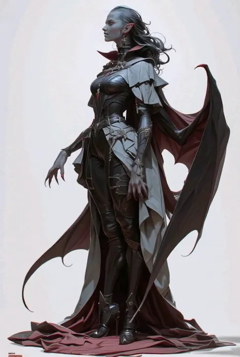 Scene-description:The image shows a detailed illustration of a female character with pointed ears, suggesting an elf-like appearance. She is dressed in a dark, intricate outfit featuring a combination of leather and fabric elements, with a flowing cape that has bat-like wings extending from the back. The character's pose is dynamic, with one hand resting on her hip and the other hanging by her side, showcasing long, sharp claws. The overall design is elaborate, with a focus on texture and shading that gives the clothing a realistic and three-dimensional look. The background is plain, ensuring the character remains the focal point.