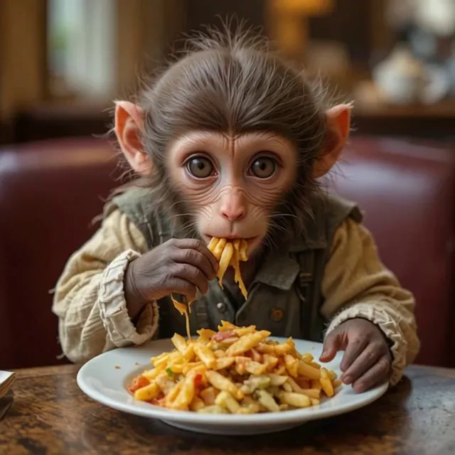 A tiny, charming monkey clad in worn, shabby clothes sits at a table in a warmly lit hotel dining room. It eagerly grasps a forkful of pasta, lifting it to its mouth with delight. The cozy ambiance, highlighted by a plush red chair behind, enhances the whimsical scene as the little creature savors its meal, creating an endearing and playful moment.
